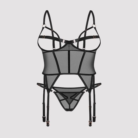 Ce superbe ensemble qui sublimera votre corps est idéal pour des soirées très coquines avec votre partenaire. Il contient une guêpière, un string, un bandeau ainsi que des gants.